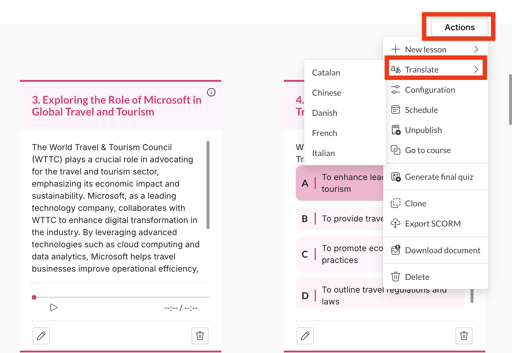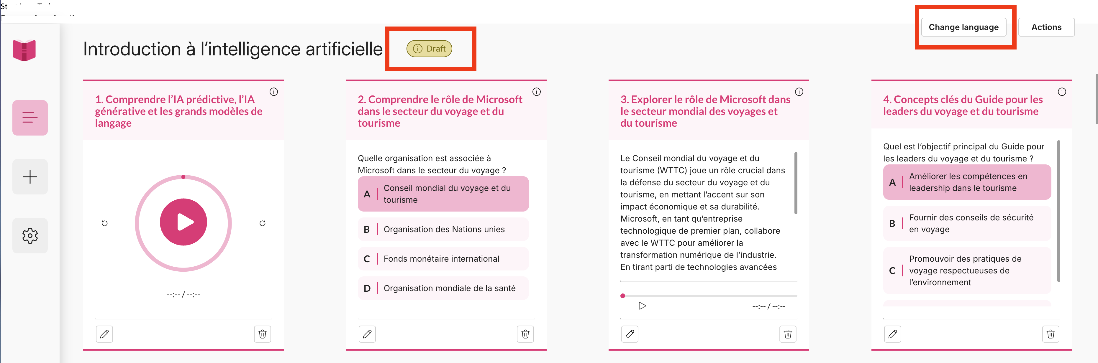 When a course is available in multiple languages, you’ll see a “**Change language**” button at the top (next to “Actions”). Click it to switch between the available language versions of the same course.&#x20;
