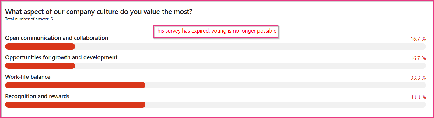 When the survey has expired, the web part displays a message that can be customized in the dedicated field. If this field remains empty, the default text will be displayed: "Survey expired!"