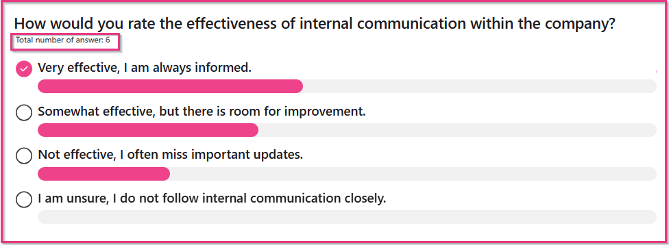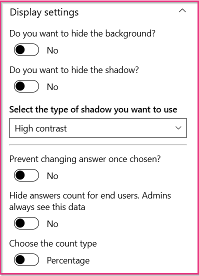 Choose the count type: you can choose between Percentage and Number. In the former case, each answer option shows the percentage of total votes it received. In the latter case, each answer option shows the number of people who selected that option.