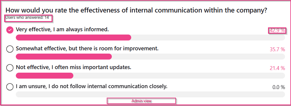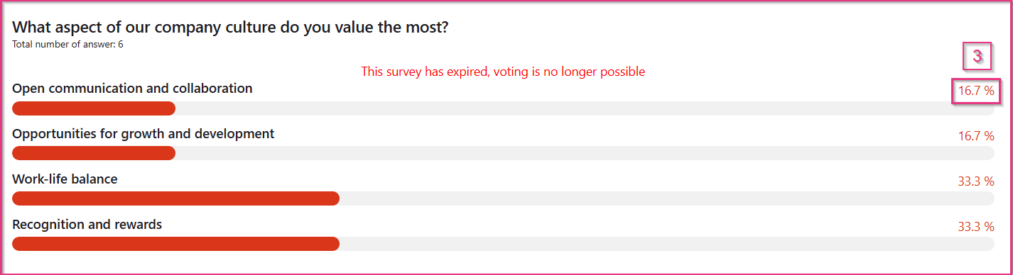 Hide answers count for end users. Admins always see this data: if you enable this option, visitors won't have access to the results of the survey. In other words, they won't see percentages. On the other hand, administrators will always see this data.